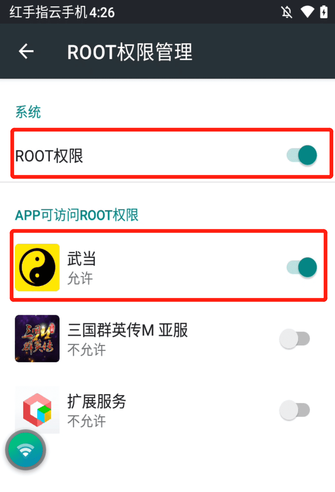 【红手指云手机】用户需要手动开启ROOT(开启方式:武当首页->右上角三个点->打开手机设置->向下滑动找到ROOT权限。)