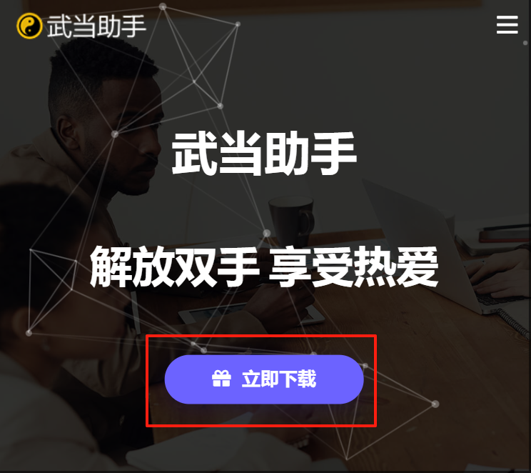 【模拟器】:从官网点击 "立即下载" 下载武当助手APP到电脑上,拖到模拟器里面。